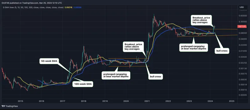 狗狗币是世界上最大的meme 加密货币,最近已经升破了其价格被广泛追踪的 50 周、100 周和 200 周简单移动平均线,结束了在熊市深度长达 20 个月的盘整。50 周均线已升至 100 周均线上方,预示着看涨势头的转变。
