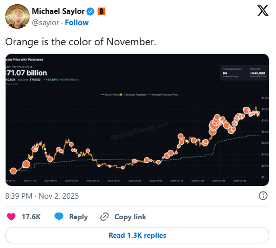 Strategy 创始人迈克尔·塞勒暗示,下周将再次进行企业比特币买入。他在 X 网站上发布了一张公司比特币投资组合的图表,目前价值710亿美元,并配文:“橙色是十一月的颜色。”