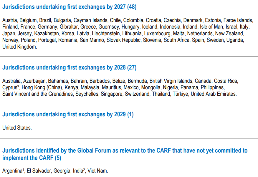其他国家似乎还在拖延。11月底,瑞士将 CARF 的实施推迟到2027年,并且仍在决定与哪些国家共享数据。同样在11月,美国正在审查国税局(IRS)加入 CARF 项目的提案。
