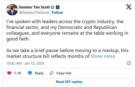 参议院更广泛的加密货币议程也在发生变化。参议院农业委员会主席约翰·布兹曼(John Boozman)也已将其委员会的标记审议推迟到一月更晚,称议员需要更多时间敲定剩余政策细节并争取广泛支持。