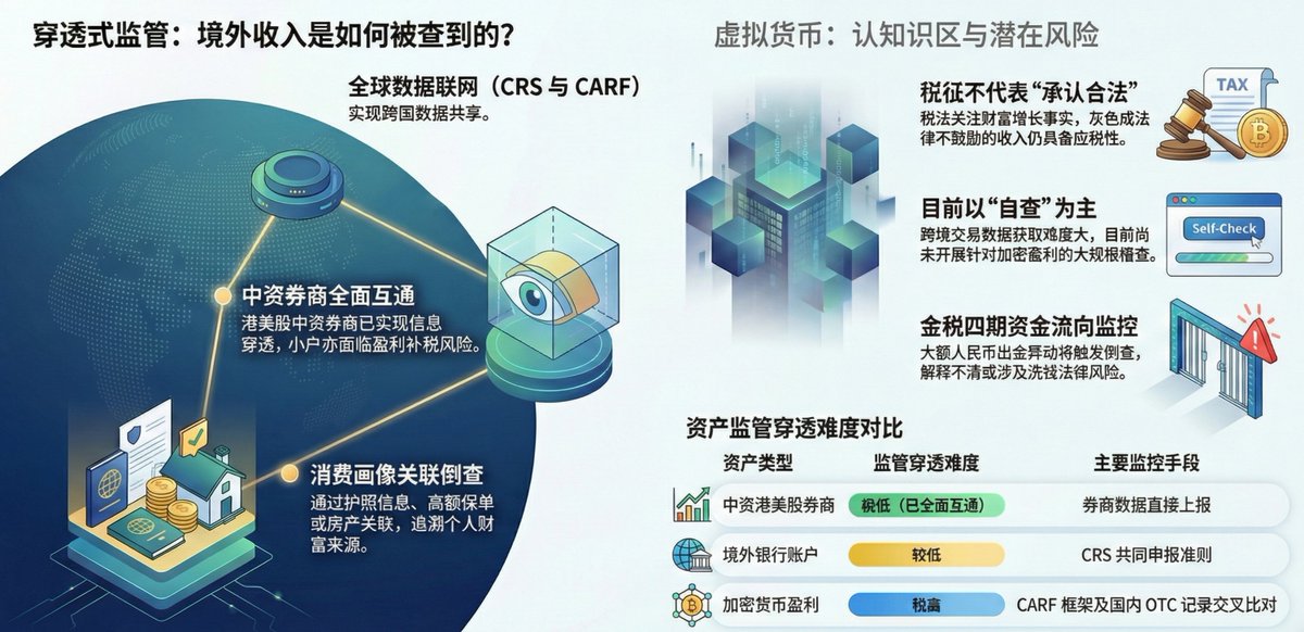 现在的追缴靠的是数据联网。CRS(共同申报准则)盯着你的境外银行账户,CARF(加密资产申报框架)盯着你的交易所账单。全球几十个国家和地区的交易所都有义务上报用户信息。