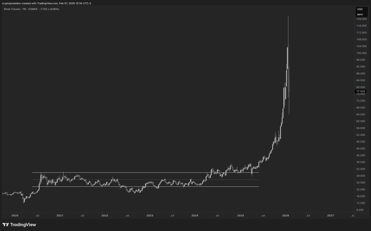 仔细观察白银图表,你会看到从73美元到120美元的抛物线暴涨仅用了三周,随后一周内暴跌40%。这正是经典的“吹顶”(Blow-off Top)。在这些激进周期末期,市场贪婪变得无法满足,成交量爆炸,导致价格剧烈波动。这不是故障,而是晚期抛物线上涨的标准特征。