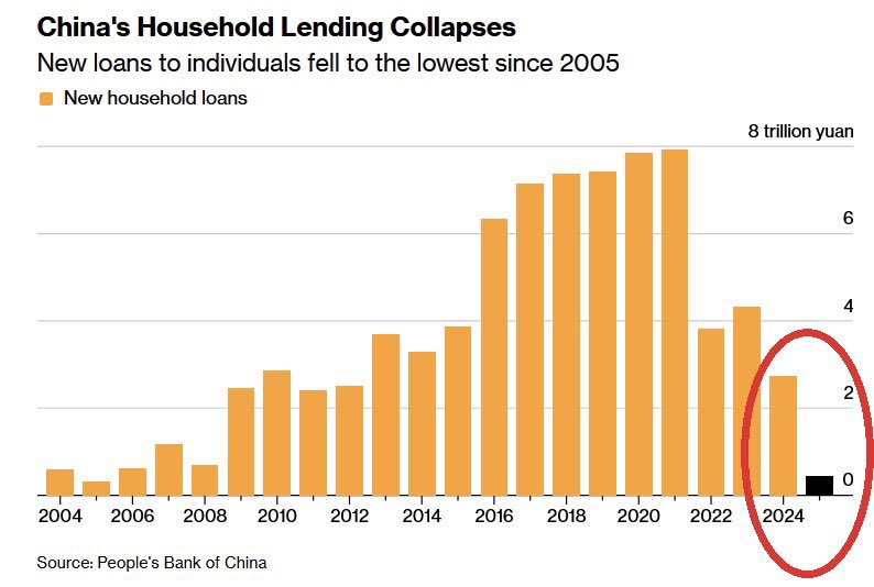 中国经济正面临前所未有的多重压力,其中房地产市场持续低迷与人口结构剧变已成为两大核心挑战。房地产行业被视为中国经济的“斩杀线”——这一隐喻指其如同一把悬在经济命脉上的利刃,一旦失控,便可能引发连锁反应,导致系统性风险。新生儿数量的急剧下滑已回落到清朝乾隆三年(1738年)的水平,而家庭贷款的断崖式下跌更凸显了消费者信心的严重缺失。2025年,中国家庭新增贷款骤降至仅4417亿元人民币,创下2005年以来的最低水平。这一数据仅相当于2024年贷款发放量的16%,跌幅高达84%。相比之下,2021年中国家庭新增贷款曾达到7.9万亿元人民币的峰值。这些现象不仅反映了房地产市场的深度危机,也预示着中国经济在消费疲软和债务压力下的苦苦挣扎。