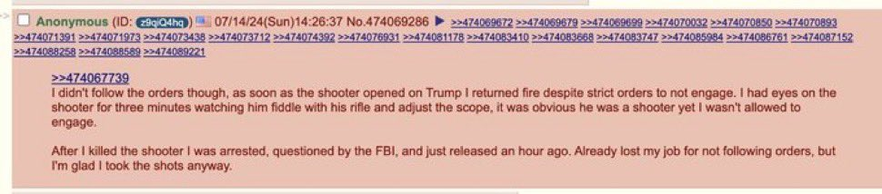 第四,特朗普遇刺后的几个小时,美国论坛出现了一个匿名贴,作者说他叫Jonathan Willis,他就是当天在屋顶上的两个狙击手之一,他向公众宣告他当时看到了暗杀者至少三分钟,但是特勤局的头拒绝给他下开枪指令。一直到对方开枪,他立刻还击打死了嫌犯。随后他被逮捕,然后被FBI问话,刚刚被释放,由于他没有听从命令即不要开枪,他已经被开除,但他说他很高兴他开了枪。