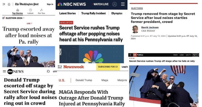 如果真是如此的话,那么为何与这些配图的主流媒体文章标题提都不提「枪手刺杀特朗普未遂」,而是说,特朗普被噪声惊得摔倒,或者特朗普摔倒了,特勤局的人扶着他离开讲台。