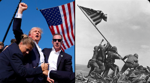 第一张:特朗普高举手臂,耳边鲜血流淌,和二战期间美军登陆硫磺岛的照片(“父辈的旗帜”)一样名垂历史,上空星条旗飘扬,俨然一副英雄不屈的形象。