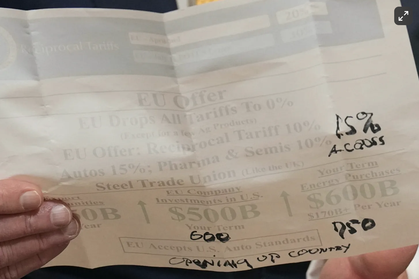 这场荒诞的协议宣布仪式,选在了苏格兰特朗普旗下的特恩伯里度假村。特朗普手持一份带有批注的神秘文件发表讲话,据《世界报》披露,文件原始内容显示欧盟最初提议要么达成零关税互免协议,要么实行10%对等关税,并额外向美国企业投资5000亿美元、能源采购6000亿美元。而最终版本中,这两个数字被分别上调至6000亿和7500亿,文件右侧空白处更赫然标注着"全面15%"的字样——这无疑是欧盟被狠狠宰割的铁证。