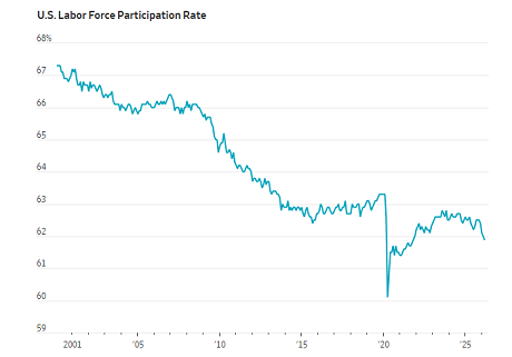 三月份的就业数据出炉时,好消息是显而易见的:就业增长稳健,失业率下降。但经济学家们没有忽略那个藏在角落里的坏消息——劳动力参与率又跌了。这个衡量劳动年龄人口中正在工作或正在找工作的人所占比例的关键指标,三月小幅降至61.9%。什么概念?除去疫情期间那个极端年份,这是1977年以来的最低水平。