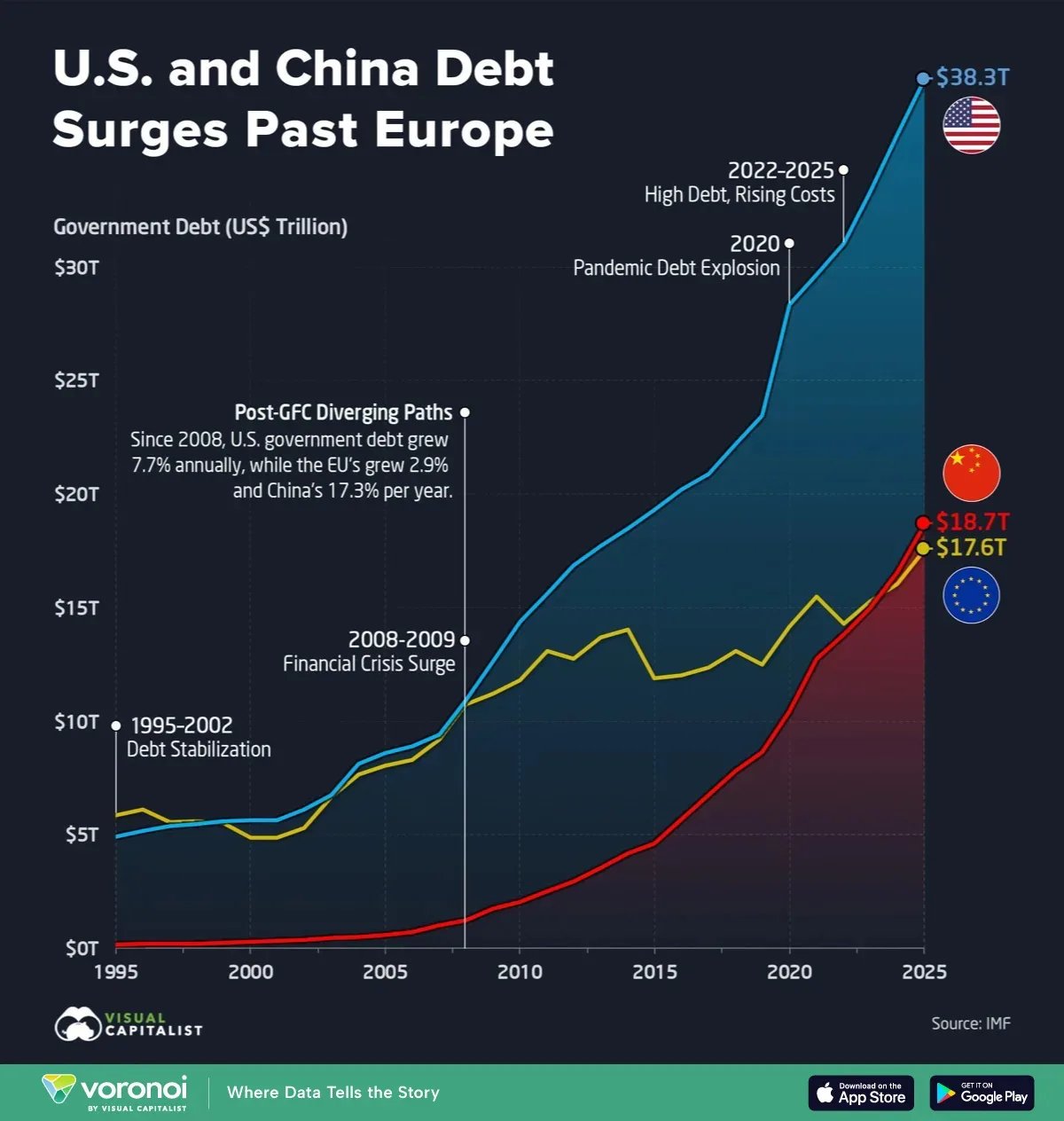 (可视化图表:一张多线图,显示1995年至2025年美国、欧盟和中国政府债务总额,单位为万亿美元。)