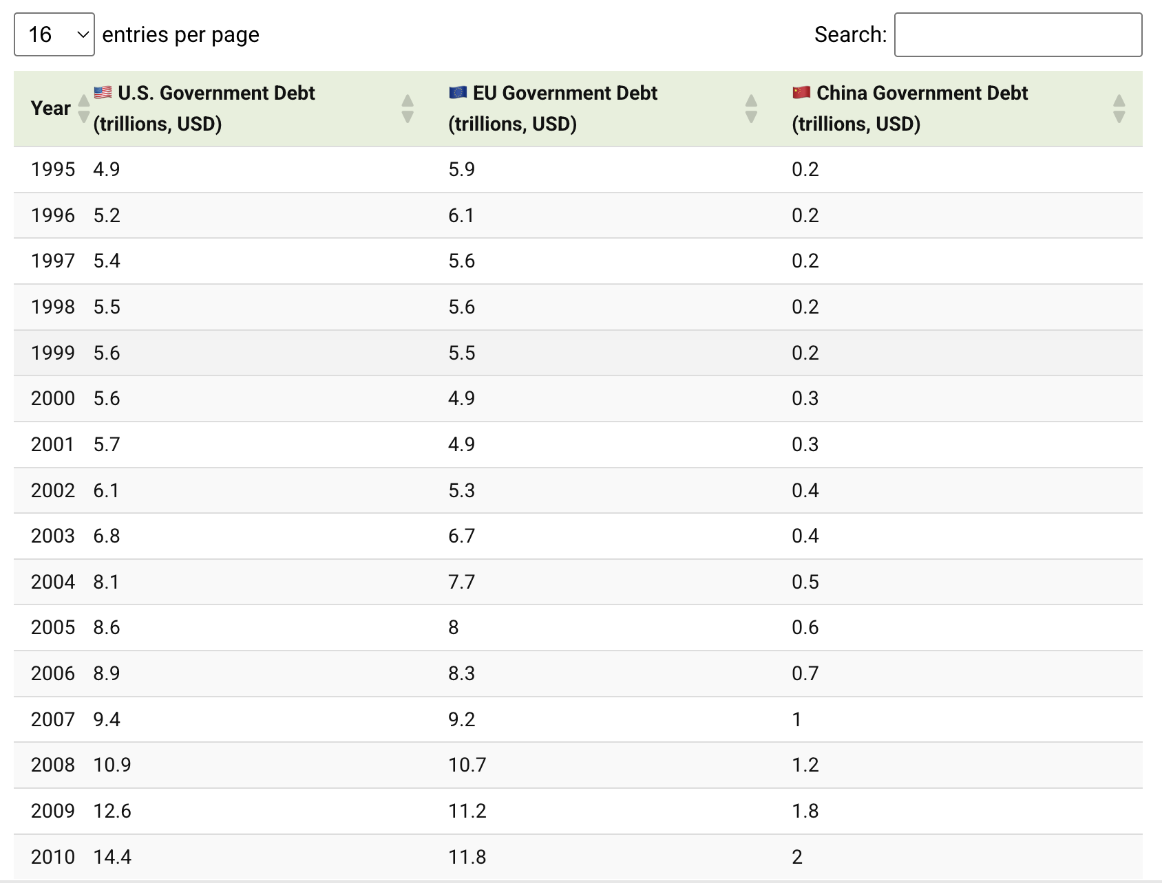 | 年份 | 美国政府债务 | 欧盟政府债务 | 中国政府债务 |