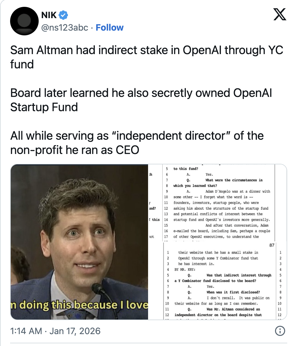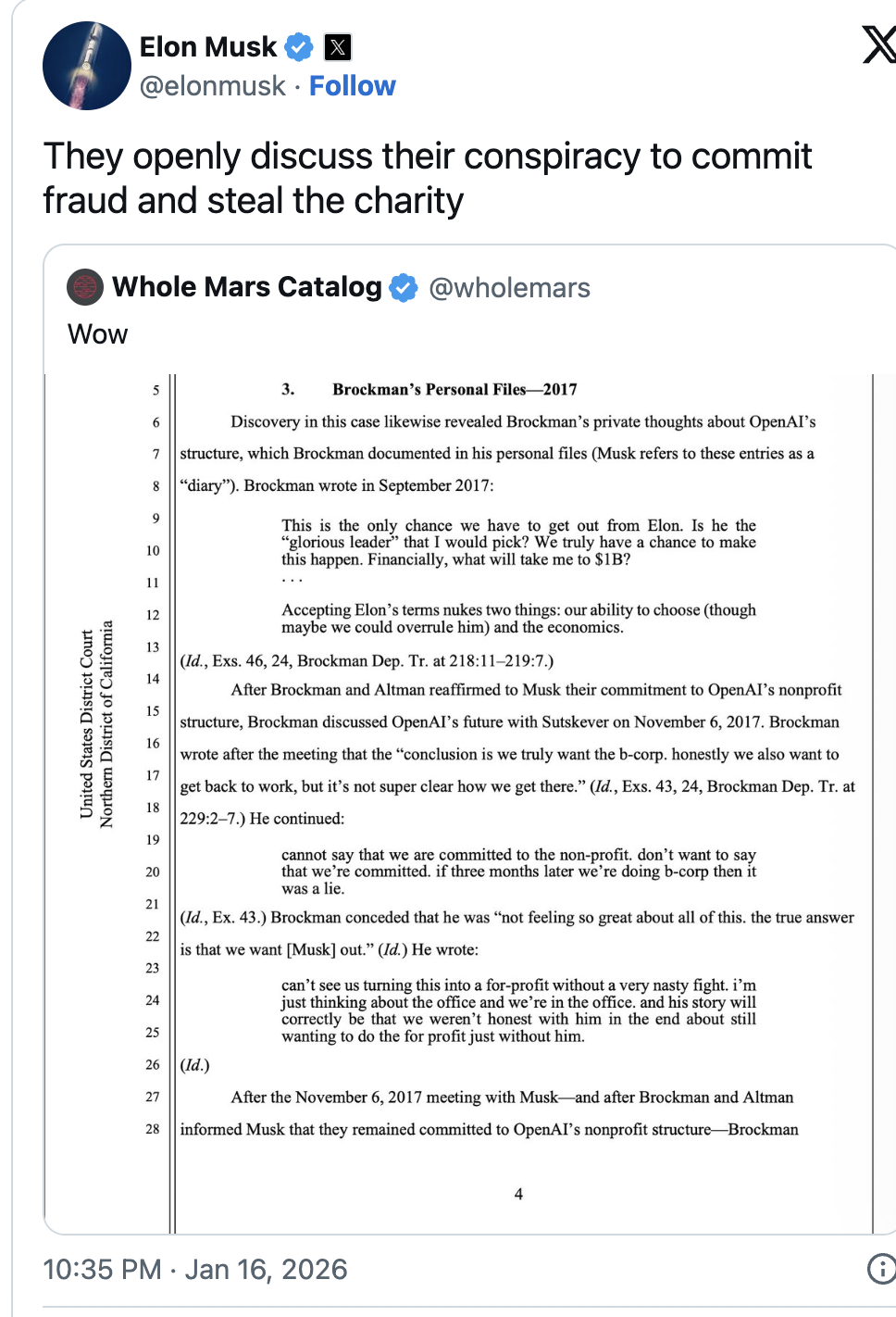 公众关注焦点大多集中在发现阶段揭露的内部文件,特别是OpenAI联合创始人Greg Brockman在2017年的私人笔记。