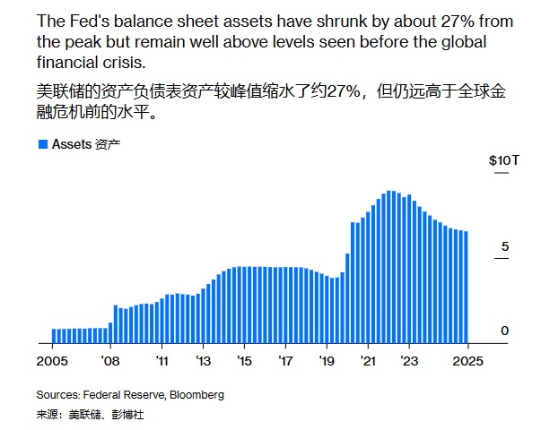 美联储的缩表行动,本意是悄然退场,却没想到在金融市场的水面上激起了层层涟漪。自2022年4月资产负债表冲上8.97万亿美元的高点后,它已稳步回落至6.56万亿美元。这并非急刹车,而是有计划地退出疫情期间为稳住经济而大规模买入的国债和抵押贷款支持证券。然而,随着准备金从“充裕”滑向“充足”,市场开始感受到微妙却真实的紧绷。