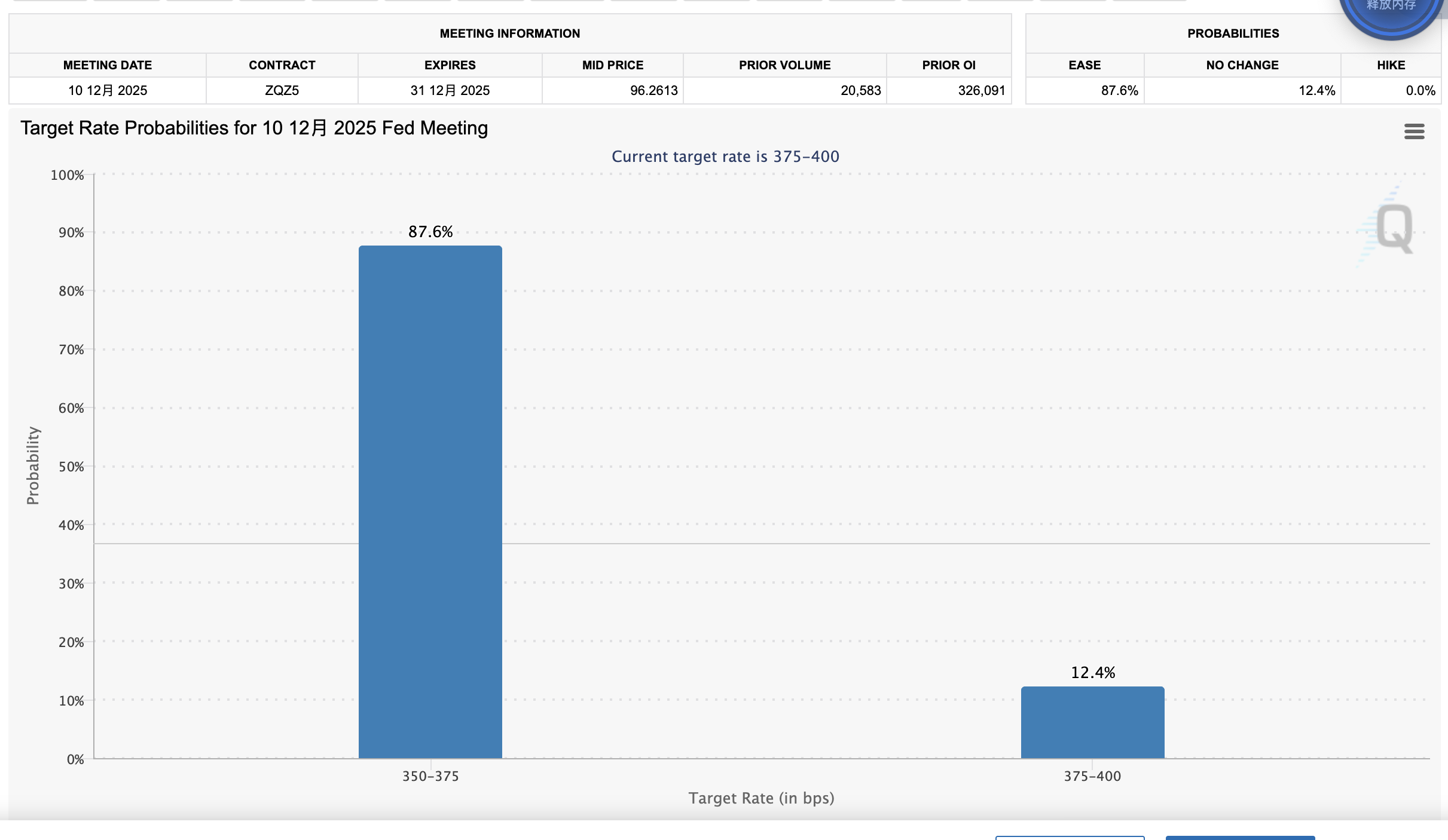 美联储的“传声筒”——华尔街日报记者尼克·蒂米拉奥斯(Nick Timiraos)近日直言,鲍威尔面临两大抉择:一是降息,但同时抬高未来降息门槛,推行“鹰派降息”——类似于上次会议的谨慎姿态;二是干脆不降息。 从蒂米拉奥斯的解读看,无论哪条路,对市场而言都透着紧缩的寒意。美联储内部鹰鸽之争已白热化,蒂米拉奥斯称,这种分歧在鲍威尔近八年任期内罕见。 当前,芝加哥商业交易所(CME)的FedWatch工具显示,12月11日FOMC会议降息25基点的概率已高达87.6%,较上月低点大幅回升。