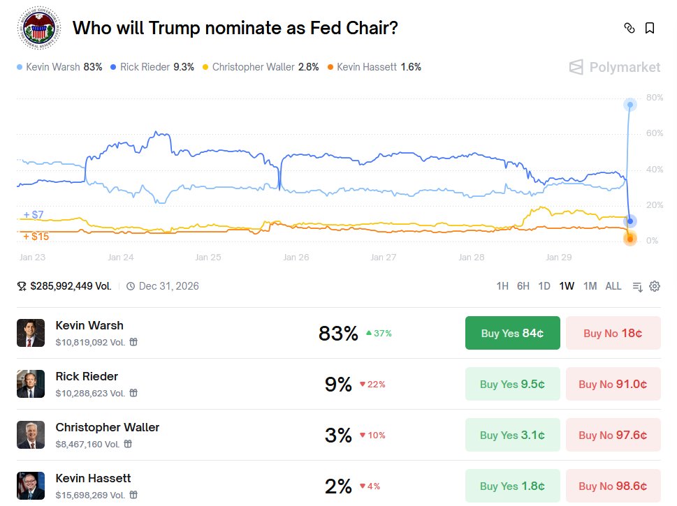 沃什随后在Polymarket从微弱领先变成绝对热门。