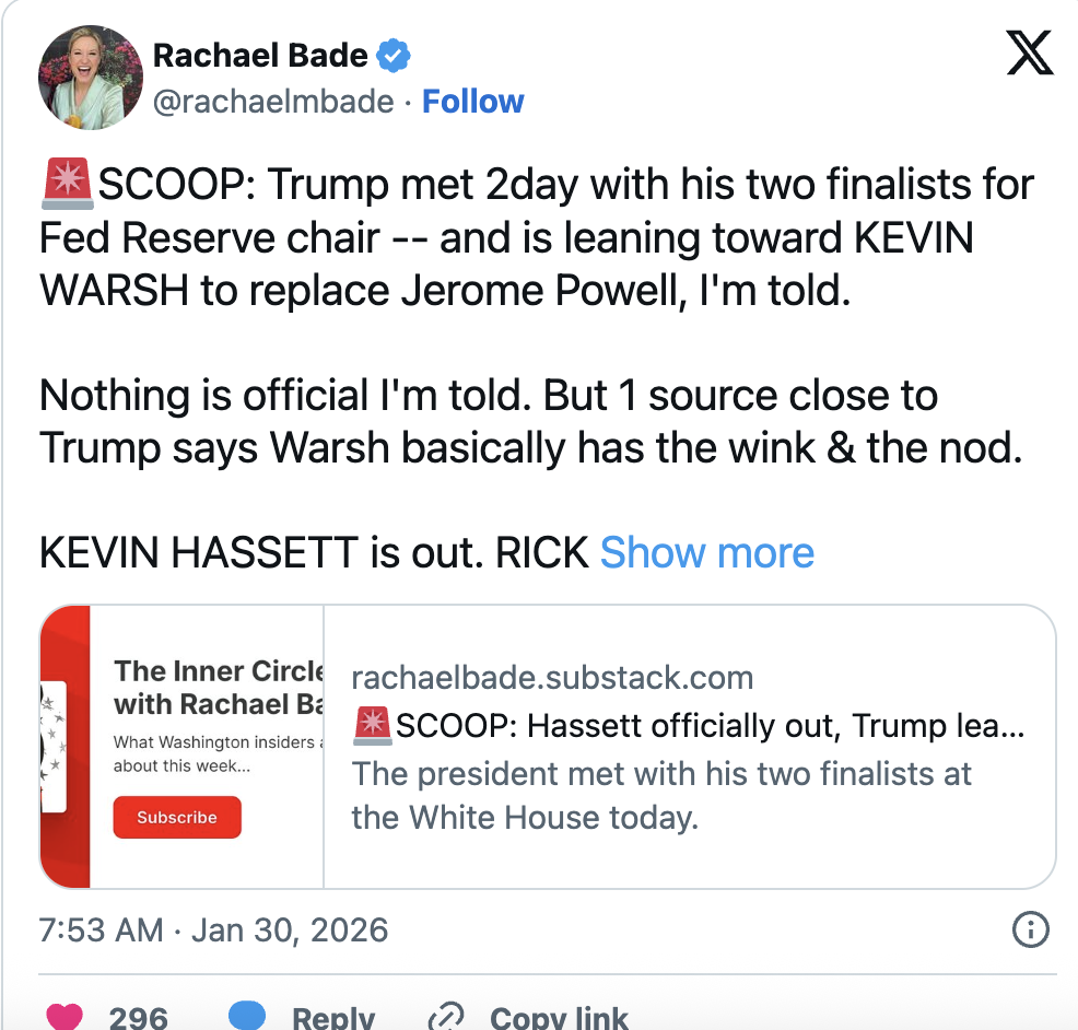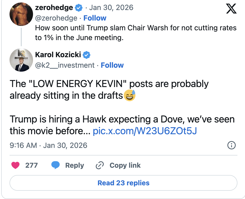 就在这时,Polymarket上凯文·沃什(Kevin Warsh)的胜出赔率突然暴涨(此前一小时我们注意到一次诡异的逆转,沃什超过里克·里德尔,这再次表明有人提前得知了消息)。一位记者报道称:“特朗普今天与两位美联储主席最终候选人会面,据我所知,他倾向于选择凯文·沃什接替杰罗姆·鲍威尔。目前尚未正式确定。但一位接近特朗普的消息人士表示,沃什基本已经获得‘默许和点头’。”