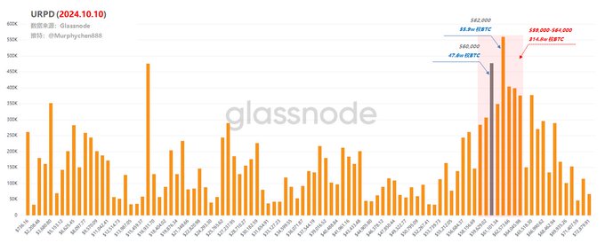2024年10月10日,最密集的堆积区是$59,000 - $64,000,有 314.8w 枚BTC在该区间内发生了换手,同样也占当时总流通的15.8%;其中最高的2根巨量柱分别是$60,000(47.6w 枚)以及$62,000(55.9w 枚)。