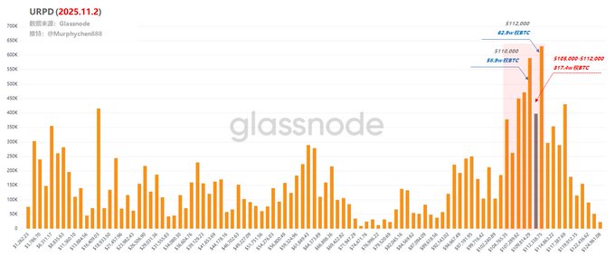 截止到11月2日,有 317.4w 枚BTC在 $105,000 - $112,000 这仅仅7000美元的狭小区间内被买入,占总流通的15.8%;其中最高的2根巨量柱分别是$110,000(58.9w 枚)以及 $112,000(62.9w 枚),意味着这里是近期大资金最密集的入场点。