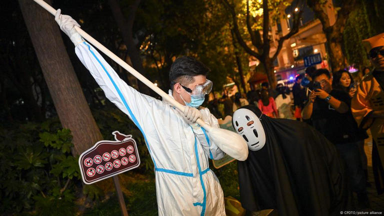 去年的万圣节是上海经历数年新冠疫情封控后的第一个万圣节。 年轻人走上街头“装神弄鬼”,同时大胆宣泄对世态的嘲讽和不满。 当时出现了许多有创意的装扮,如穿着全套防护服的防疫人员“大白”、举着“学医救不了中国人”牌子的鲁迅、身上贴满白纸的女子,令人联想到“白纸运动”等。
