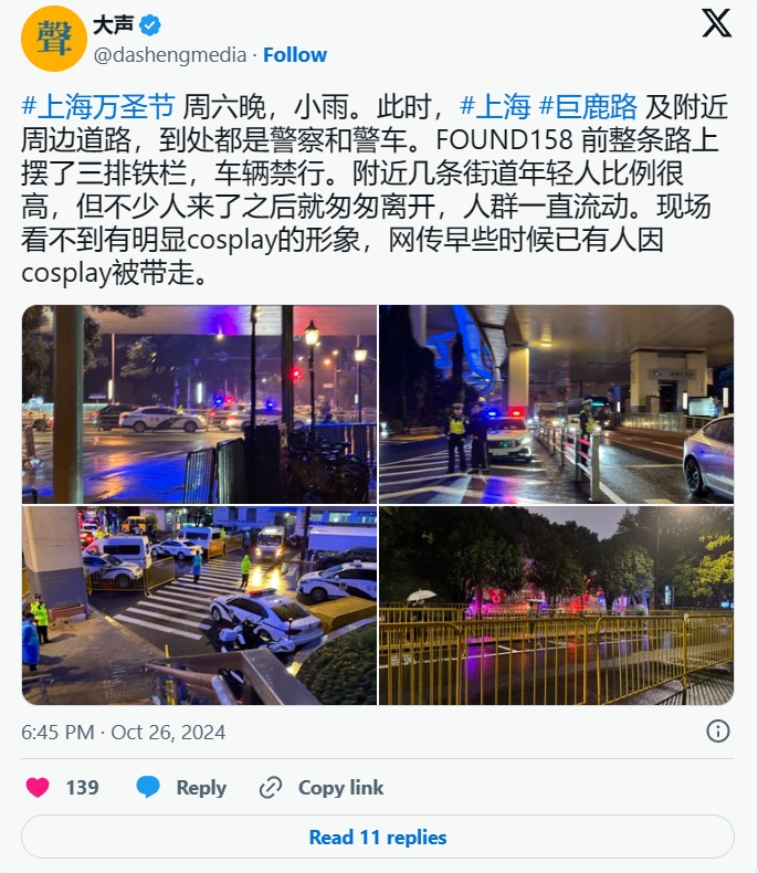 不过,在这个万圣节前的周末,却传出上海当局限制万圣节变装狂欢的消息。 一些网友在微博、小红书等社群媒体上表示,往年万圣节挤满狂欢人潮的巨鹿路、长乐路等地已被封锁并部署警力,在地铁站也有警察驻守,见到奇装异服者便劝返。 微博上有人揶揄:“我以为今年大家都cos警察呢,走近一看原来都是真警察。”