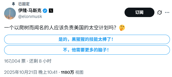 这下,马斯克彻底被激怒了。他立马又发了一篇帖子,还发起了一个投票,就是为了嘲讽Duffy:“一个以爬树为最大成就的人,应该来管理美国的太空计划吗?”