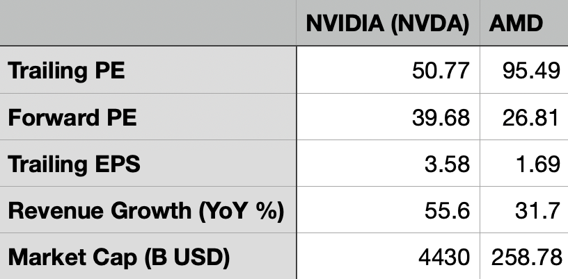 两家公司财务数据显示,NVIDIA仍是成长王者,但AMD的估值更亲民。以下基于Yahoo Finance最新数据(截至2025年9月30日),比较Trailing(过去12个月)和Forward(预期)指标,以及过去5年EPS年化成长率(基期)。
