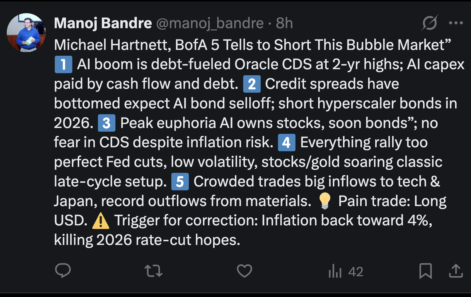 首先,美银首席投资策略师Michael Hartnett在其2025年10月31日的报告中,对AI表示强烈看空。主要原因是 AI 繁荣过度依赖债务融资,他警告 AI 基础设施资本支出(capex)由现金流和债务支撑,如果不可持续,可能引发“崩盘”。他特别提到信用利差已见底,建议做空 2026 年成熟的超大规模公司(hyperscaler)债券,预期会出现 AI 债券抛售潮,这可能引发更广泛的市场泡沫破裂。同时,他指出如果通胀重新加速至 4%,将结束 2026 年预期中的 81 次全球降息,导致 2026 年市场修正或熊市风险上升。