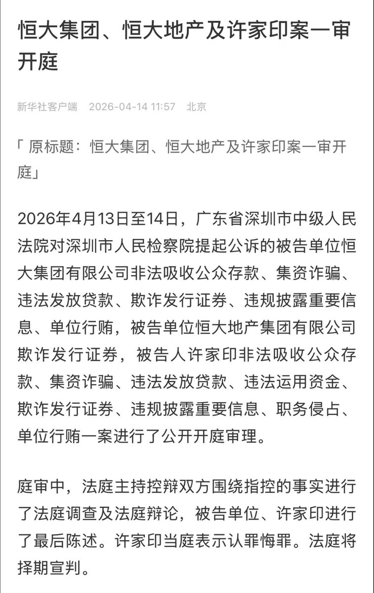 中国恒大创始人许家印在深圳中级人民法院承认多项罪名,包括集资诈骗和贿赂等。