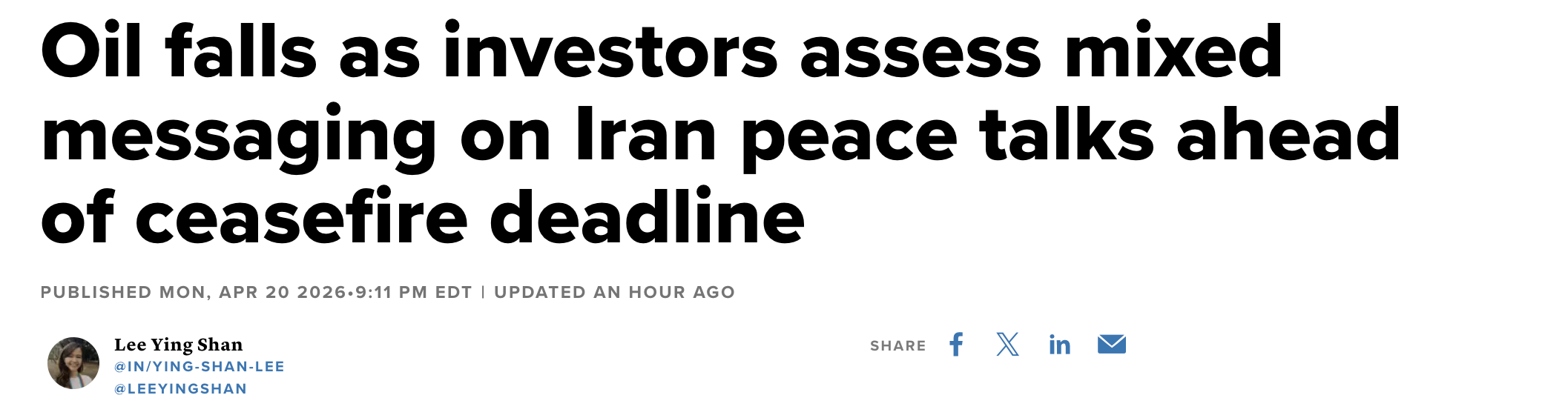 CNBC头条直指「伊朗停火谈判发出矛盾信号 停火期限将至 油价回落」,正是这一混乱的真实写照。