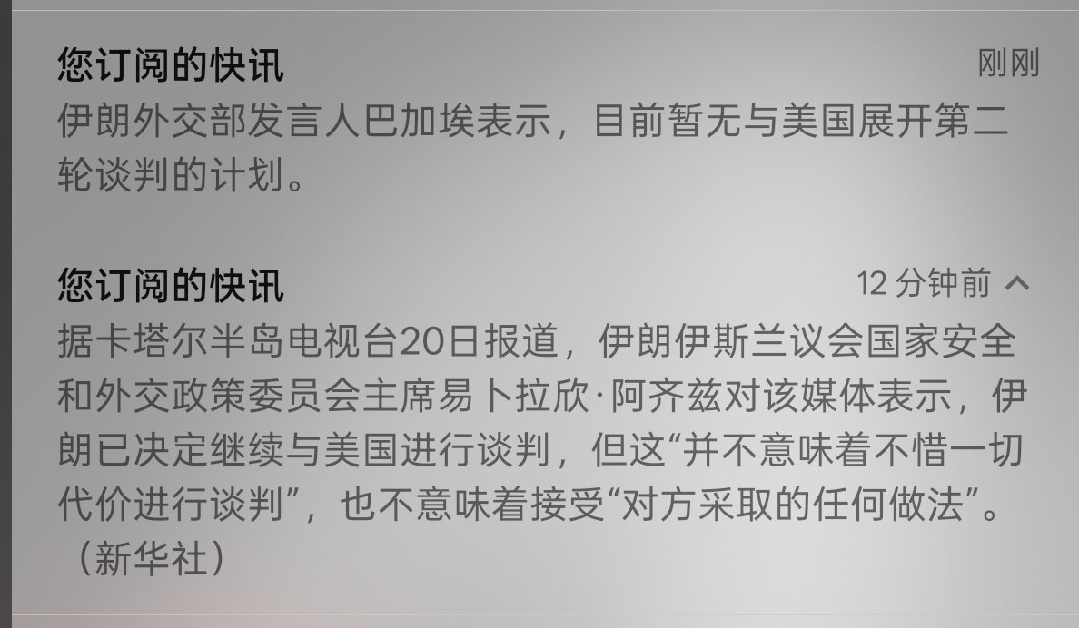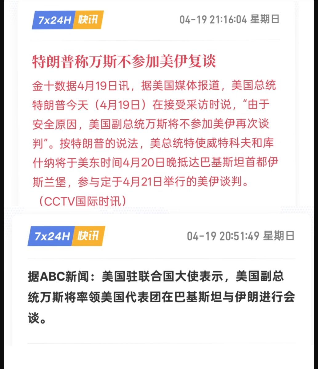 4月20日白天:特朗普在接受彭博新闻采访时“左右互搏”——一方面称“对伊朗谈判有好消息”,副总统万斯(JD Vance)率领的美国代表团将很快赴巴基斯坦伊斯兰堡开启第二轮谈判,协议“可能很快达成”;另一方面明确表示“停火周三晚结束,极不可能延长”,并警告“若无协议,大量炸弹将开始爆炸”。