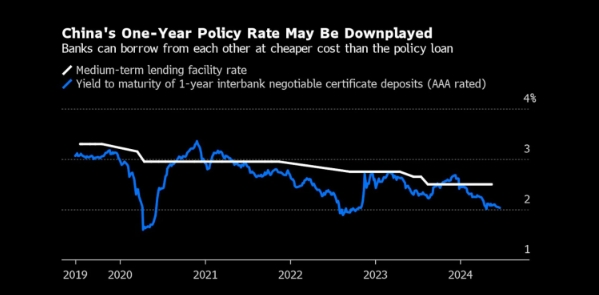 一年期MLF是一组选定的商业银行在此期间向中央银行借款的利率。但近几个月来,银行对央行的资金需求下降,因为其相互融资的利率更低。这削弱了MLF引导实际借贷成本的能力。与MLF相比,七天期逆回购利率为政策微调提供了更大的灵活性。