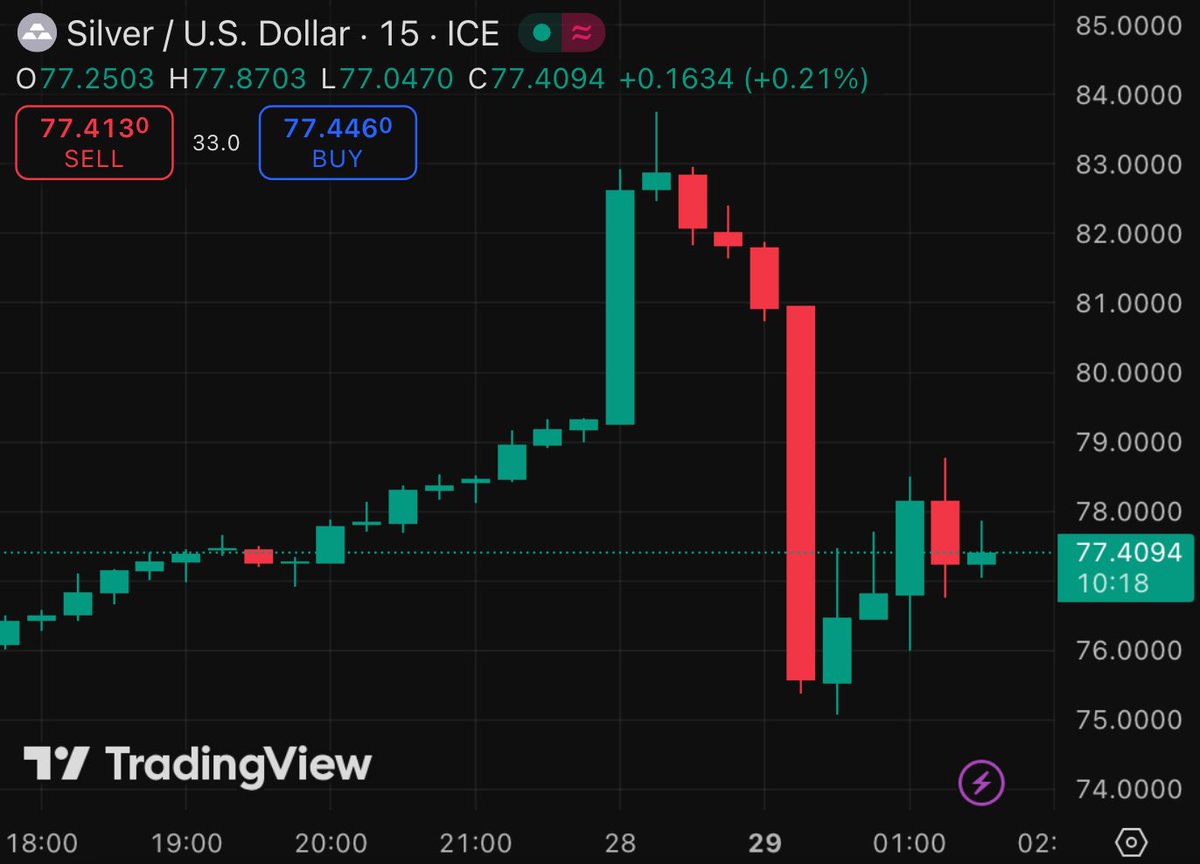 今早冲高到 83.7 美元/盎司,直接向下暴力来了个 -10% 插针,做多的估计有些都爆仓了。