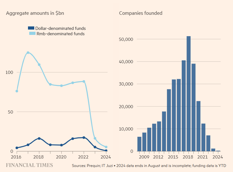 据数据提供商IT Juzi称,2018年,在风险投资的鼎盛时期,中国有51302家初创企业成立。到2023年,这一数字骤降至1202家,而今年的数字有望更低。