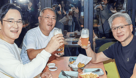 首尔街头,一家名叫Kkanbu Chicken的炸鸡店内,英伟达CEO黄仁勋与三星电子会长李在镕、现代汽车会长郑义宣围坐一桌,举杯啤酒、品尝炸鸡。这场看似轻松的聚会,其实是一场全球芯片版图的“三国峰会”。