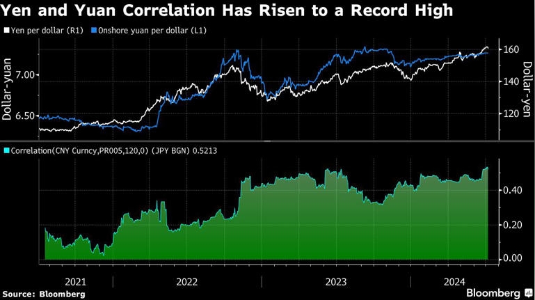 美元兑人民币和美元兑日元货币对的120天相关性本周升至0.54,这是彭博自2007年以来汇编该数据以来的纪录高点。