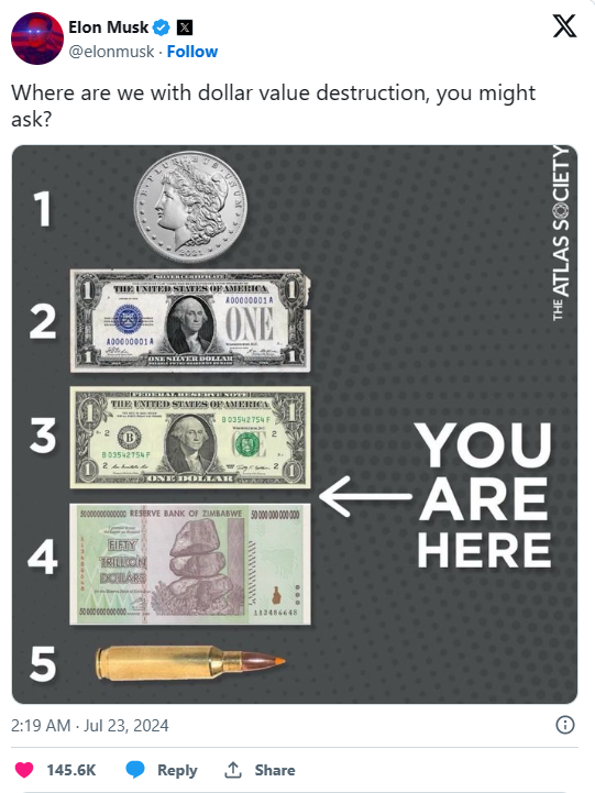 马斯克在最近的推文中表示,美元正在贬值,可能会变得像津巴布韦元一样。
