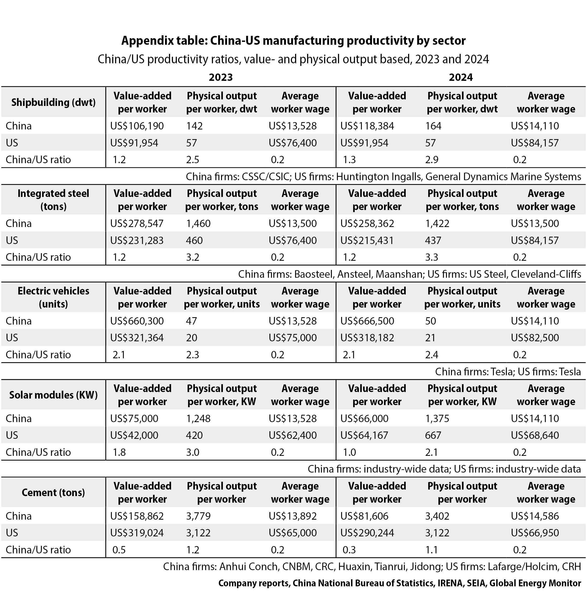 在本研究中,我考察了中美两国都有重要生产商的五个行业,这些行业有可用的实体产量衡量指标:造船、综合钢铁厂、电动汽车、太阳能光伏组件和水泥。除太阳能组件行业整体数据被视为可靠外,劳动生产率数据来源于上市公司年报或10-K报告。电动汽车数据来自特斯拉,该公司在加州和上海运营超级工厂,生产相同的车型。