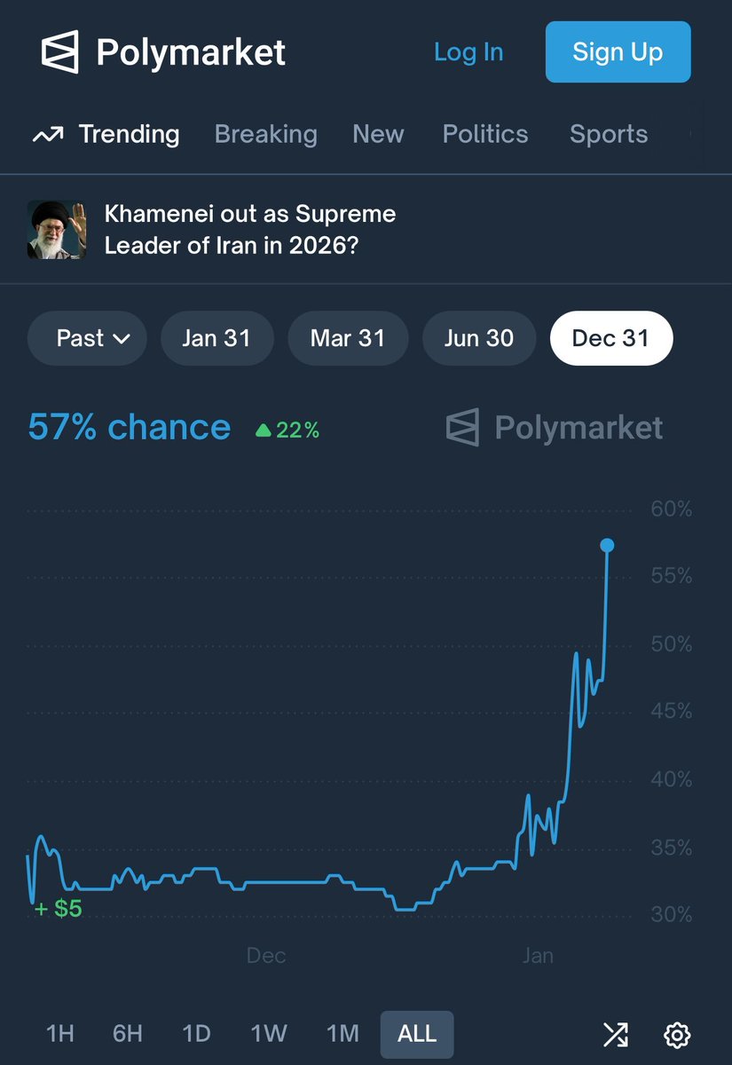 预测市场Ploymarket 对“哈梅内伊2026年是否不再担任伊朗最高领袖”的投注概率已达57%,较此前大幅上涨22%。图表显示,从去年底的低位一路攀升,尤其在近期伊朗抗议爆发后加速。这反映了投注者对伊朗政权稳定性的悲观预期。