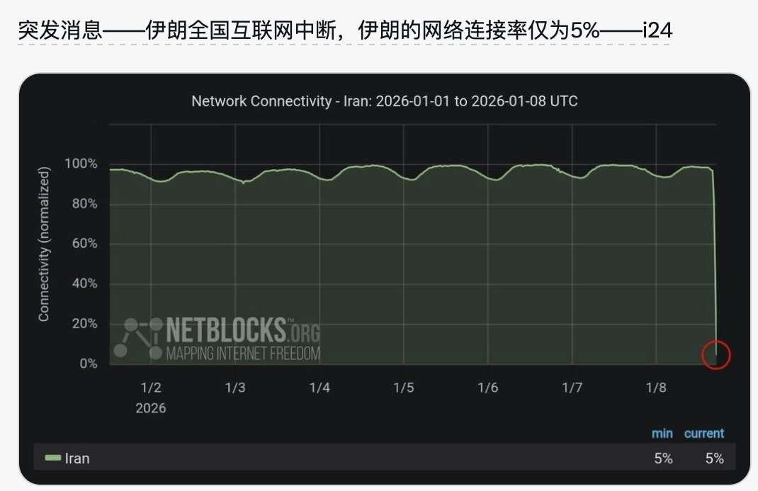 现在,伊朗网络连接率从1月1日的近100%暴跌至1月8日的仅5%。这不是技术故障,而是典型的政府行为——在2019年、2022年等大规模抗议中,伊朗当局就曾多次切断互联网以阻断信息传播和组织协调。目前抗议已蔓延多个城市,报道称有数十人死亡、上千人被捕。