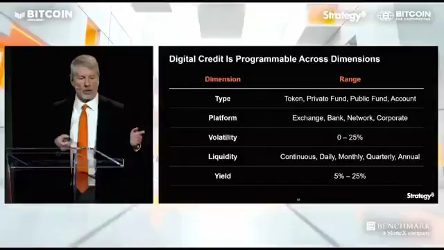他明确说:比特币仍是核心资本资产(capital base),而“可编程数字信贷”是指把比特币抵押的收益型金融产品(像他们发行的Perpetual Stretch Preferred Stock,可变优先股)做成可编程的代币化工具。